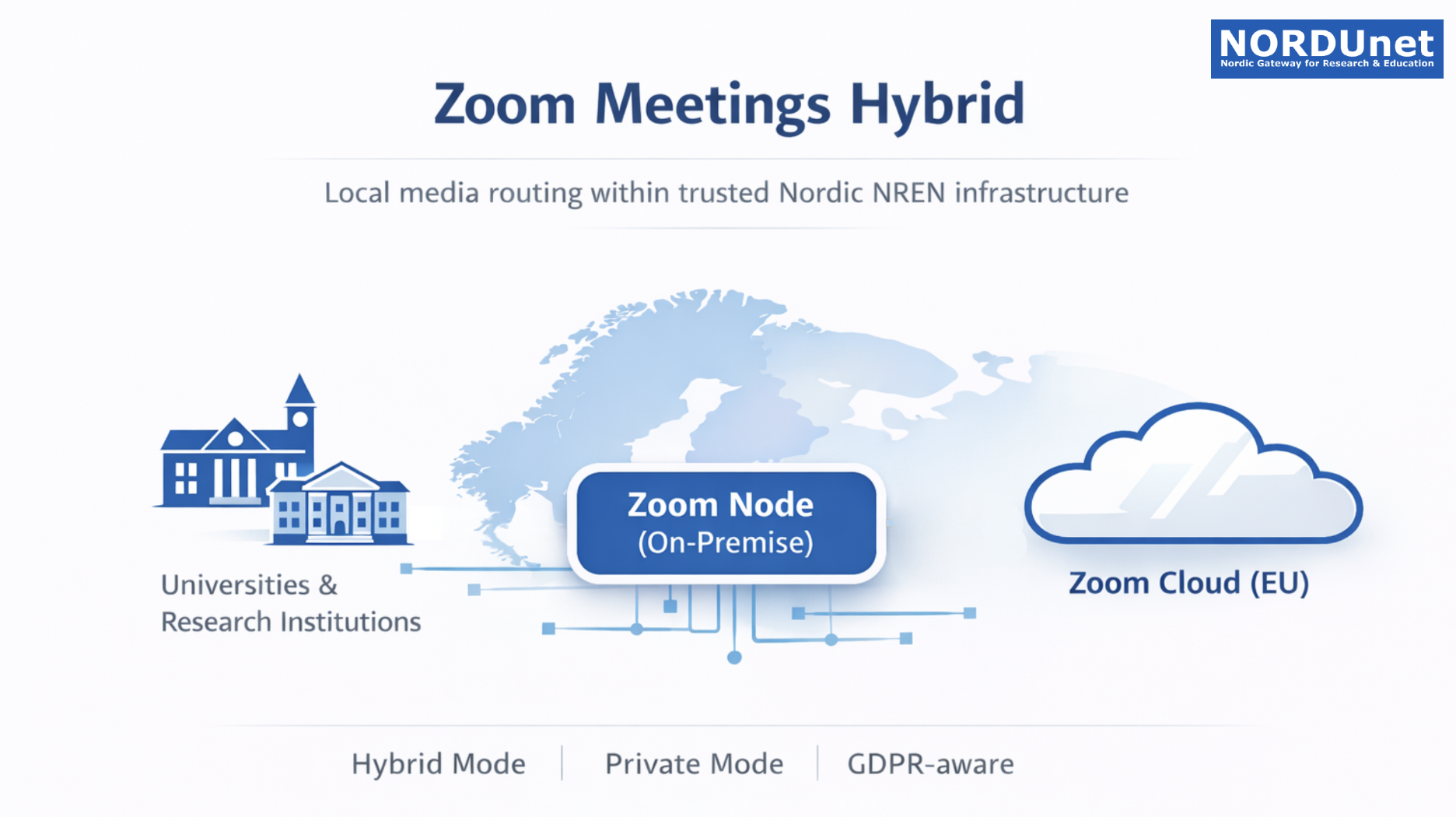 Zoom Meetings Hybrid enables institutions to route selected meeting media within the trusted Nordic NREN and NORDUnet networks, while still benefiting from Zoom’s cloud-hosted features in a controlled, GDPR-compliant European environment. The solution combines the flexibility of cloud services with the control and security of local infrastructure — tailored for the needs of research and education.